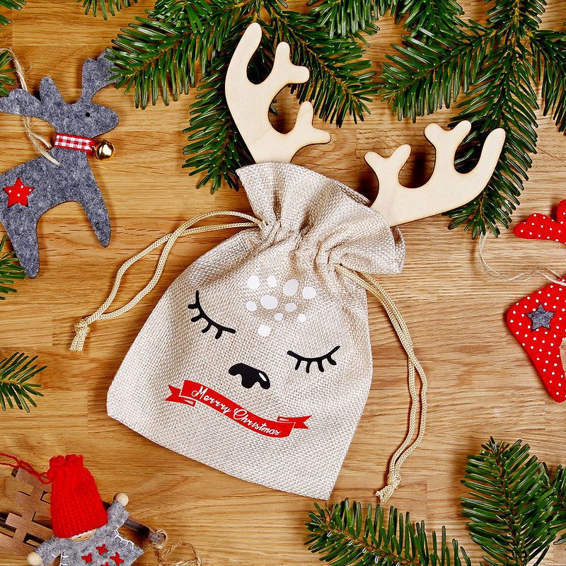 La bolsa de regalo de tela es de color natural claro y tiene unas dimensiones de 13 x 18 cm. La bolsa se distingue por su doble cordón en el cierre y un estampado decorativo navideño que representa la cabeza de un reno.