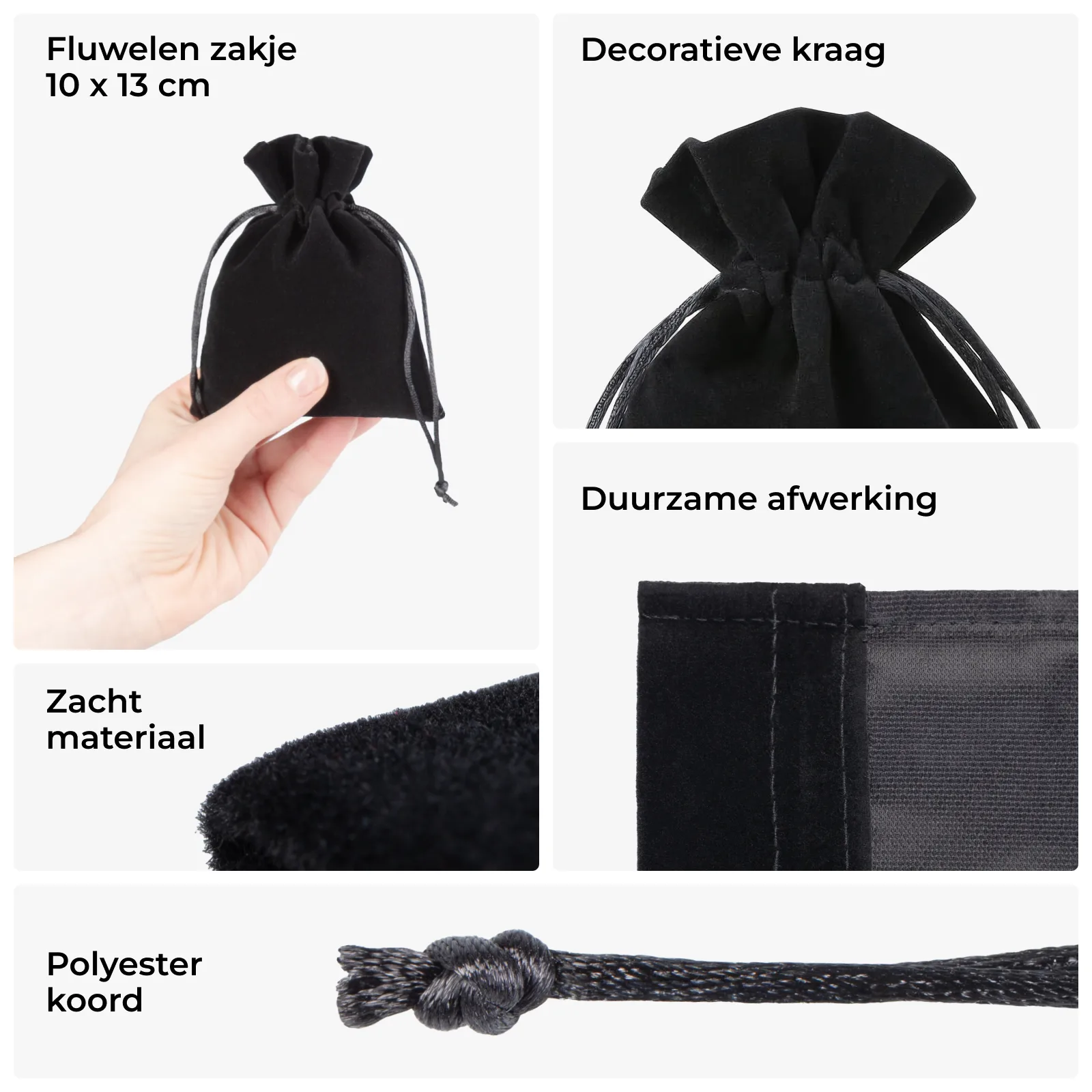 Fluwelen zakjes 10 x 13 cm in zwart zijn kleine, elegante verpakkingszakjes die ideaal zijn voor sieraden, kleine cadeaus en premium accessoires. De set bevat 10 stuks, gemaakt van zacht fluweel en voorzien van een dubbel trekkoord, zodat de zakjes snel en veilig kunnen worden gesloten. Dankzij het compacte formaat zijn ze geschikt voor zowel persoonlijk gebruik als professionele productpresentatie.