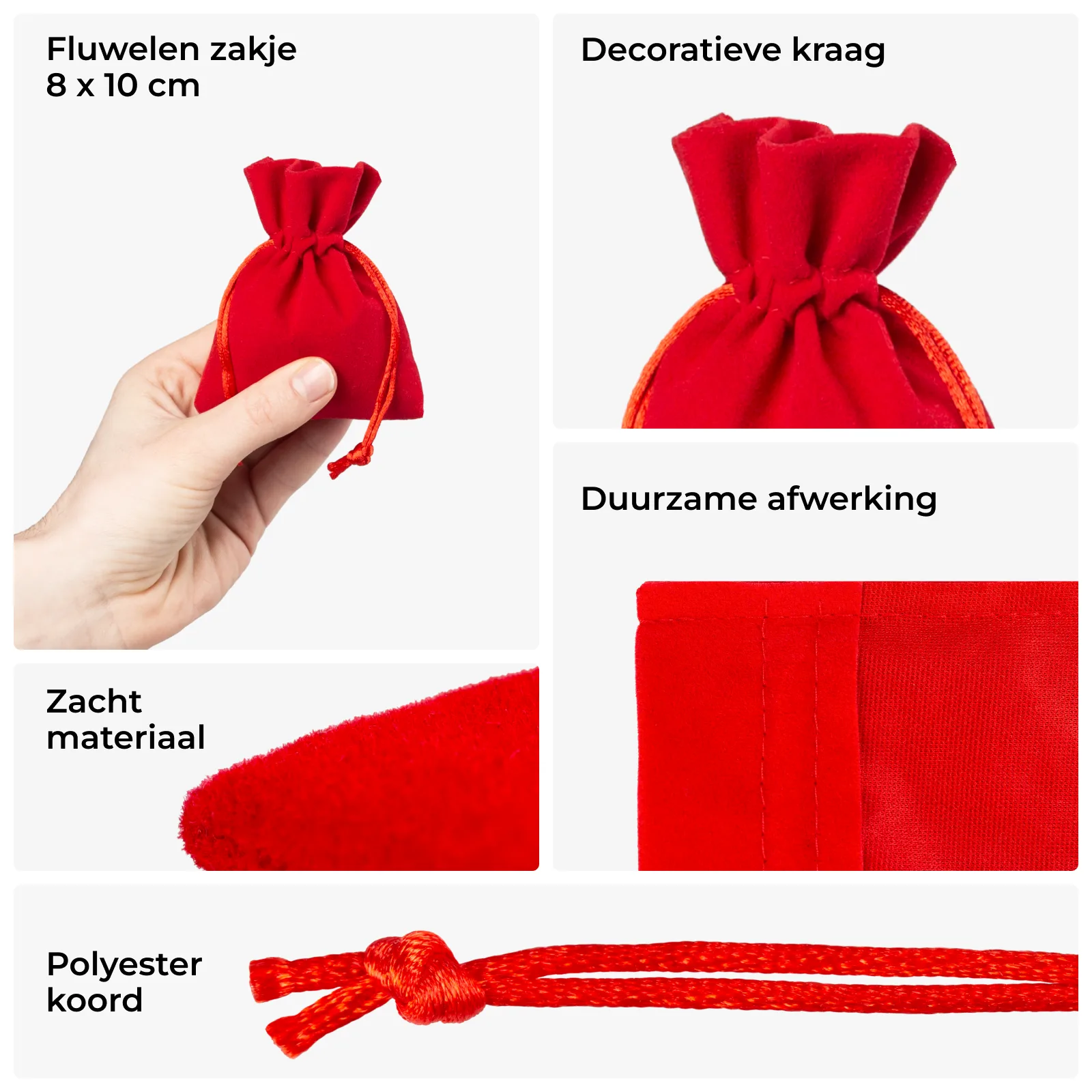 Rode fluwelen zakjes maat 8×10 cm We bieden u een set van 10 stuks zakjes gemaakt van fluweel met afmetingen van 8 x 10 cm. Dit praktische pakket is verkrijgbaar in de kleur rood en zal voor een langere periode dienen.De zakjes in deze aanbieding zijn gemaakt van fluweel, ook wel plush genoemd. Het is een zeer zachte en prettige stof die al vele jaren als exclusief wordt beschouwd en nog steeds wordt gebruikt voor kleding en meubelstoffering.Dankzij hun esthetische en functionele kenmerken zijn fluwelen zakjes een uitstekende manier om dagelijkse voorwerpen en kleine cadeaus en geschenken te verpakken. De duurzame structuur van de fluwelen stof zorgt ervoor dat deze zakjes een goede bescherming bieden voor de items die erin verborgen zijn. Fluweel is pluizig en prettig om aan te raken, daarom zijn onze zakjes perfect als cadeau voor een dierbare of als cadeau voor een jubileum of andere feestelijke gelegenheid. Tips en adviezen voor gebruik Onze rode fluwelen zakjes van 8×10 cm zijn een uitstekende keuze voor bedrijven die op zoek zijn naar stijlvolle en functionele verpakkingen. Gemaakt van hoogwaardig fluweel, zijn ze niet alleen esthetisch, maar ook zeer praktisch. Technische specificaties: Afmetingen: 8×10 cm Materiaal: Hoogwaardig fluweel Kleur: Rood Sluiting: Praktisch koord voor eenvoudig en snel sluiten Voordelen en toepassingen: Elegant uiterlijk: Fluweel voegt luxe en elegantie toe, ideaal voor cadeaus, bedrijfsgadgets en sieraden. Duurzaamheid: Fluweel is duurzaam en kan meerdere keren worden gebruikt, waardoor het een milieuvriendelijke oplossing is. V veelzijdigheid: Ideaal voor speciale gelegenheden zoals Kerstmis of Valentijnsdag, maar ook voor dagelijks gebruik. Hoe optimaal gebruik te maken van fluwelen zakjes: Opslag van sieraden: Deze zakjes zijn perfect voor het opbergen van sieraden, ter bescherming tegen krassen en beschadigingen. Cadeauverpakkingen: Dankzij hun elegante uiterlijk zijn ze uitstekend geschikt voor geschenkverpakkingen, waardoor elk cadeau extra charme en klasse krijgt. Bedrijfsgadgets: De mogelijkheid om het bedrijfslogo te printen maakt de zakjes tot een geweldig marketinginstrument dat de merkbekendheid vergroot. Personalisatie en branding: Een van de grootste voordelen van onze zakjes is de mogelijkheid tot volledige personalisatie. U kunt uw bedrijfslogo, slogan of zelfs fotokwaliteit afbeeldingen op de zakjes plaatsen. Hierdoor worden de zakjes niet alleen een verpakking, maar ook een effectief marketinginstrument dat de merkherkenning versterkt. Extra diensten: Gratis visualisatie: Voordat u uw bestelling definitief maakt, bieden wij een gratis visualisatie aan, zodat u kunt zien hoe de afdruk op de geselecteerde zak eruit zal zien. Snelle realisatie: Wij bieden een snelle orderafhandeling, zelfs binnen 2 werkdagen, wat vooral belangrijk is tijdens de drukke kerstverkoopperiode. We nodigen u uit om te bestellen en samen te werken met onze stijlvolle fluwelen zakjes, die zeker de prestige van uw merk en producten zullen verhogen.