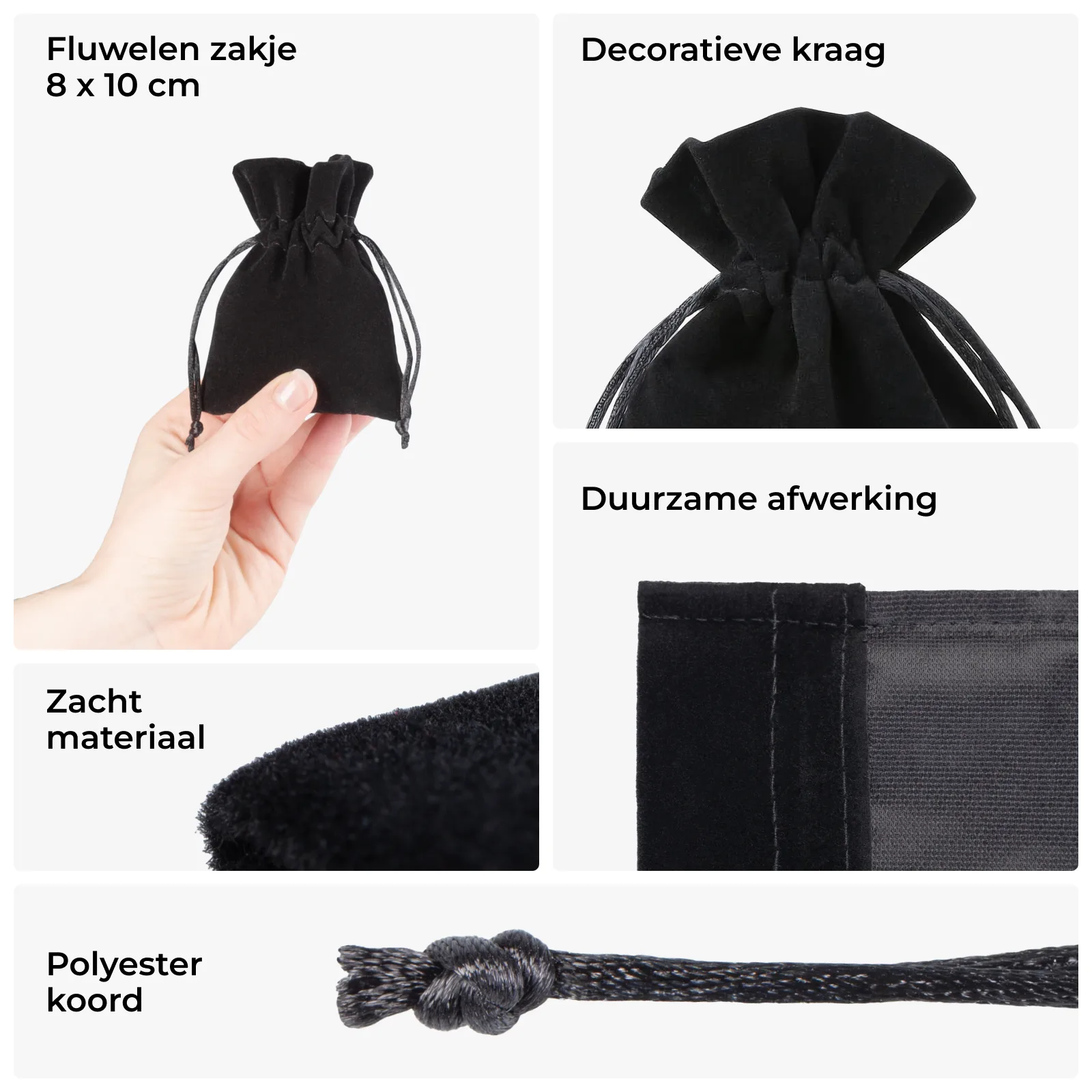 Fluweel is een zachte stof met een korte, gelijkmatige pool die licht subtiel weerkaatst. Dat geeft de zakjes een elegante uitstraling en beschermt de inhoud tegen lichte krassen. De zwarte kleur vormt een chic contrast met goud, zilver en edelstenen – ideaal voor sieraden, accessoires of kleine premium items. Het materiaal blijft netjes en behoudt zijn vorm, ook wanneer het zakje vaak wordt geopend en gesloten.