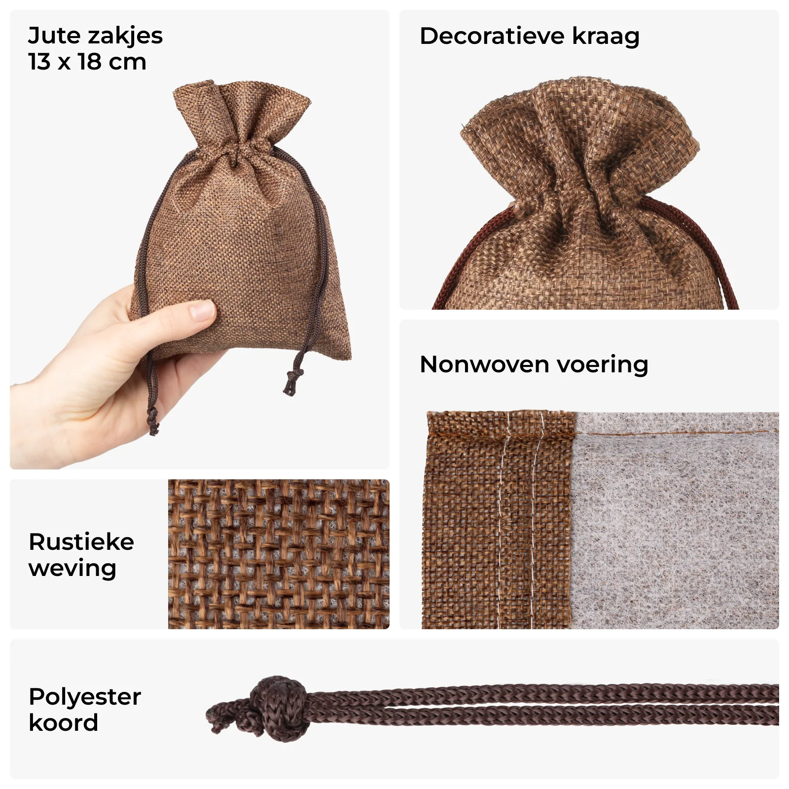 10 stuks jutezakjes in de kleur donkere natuurlijke in het formaat 13 x 18 cm.De door ons aangeboden zakjes zijn vervaardigd van natuurlijke of synthetische jute, die gekenmerkt wordt door sterkte en het karakteristieke "touwtjesuitzicht". Beide stofzakjes absorberen vocht en geven vocht af, daarom verdragen ze goed variƫrende omgevingsomstandigheden.Jutezakjes gaan uitstekend samen met natuurlijke decoraties, biovoeding, natuurlijke geuren en andere ecologische producten, waardoor ze perfect bijeenkomsten van het type vintage en evenementen gestileerd op een dorpsklimaat en een Oud-Pools traditioneel feest benadrukken.Ons aanbod jutezakjes bevat eveneens modellen die speciaal in veel verschillende kleuren zijn geverfd, daardoor zal iedereen een jutezakje kunnen vinden dat ideaal voor hem is.