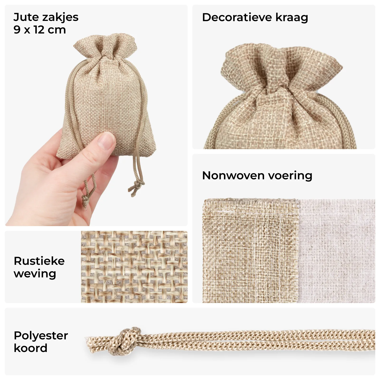 10 stuks jutezakjes in de kleur natuurlijke in het formaat 9 x 12 cm. De door ons aangeboden zakjes zijn vervaardigd van natuurlijke of synthetische jute, die gekenmerkt wordt door sterkte en het karakteristieke "touwtjesuitzicht". Beide stofzakjes absorberen vocht en geven vocht af, daarom verdragen ze goed variƫrende omgevingsomstandigheden. Jutezakjes gaan uitstekend samen met natuurlijke decoraties, biovoeding, natuurlijke geuren (bijv. als zakje voor lavendel) en andere ecologische producten, waardoor ze perfect bijeenkomsten van het type vintage en evenementen gestileerd op een dorpsklimaat en een Oud-Pools traditioneel feest benadrukken. Ons aanbod jutezakjes bevat eveneens modellen die speciaal in veel verschillende kleuren zijn geverfd, daardoor zal iedereen een jutezakje kunnen vinden dat ideaal voor hem is.