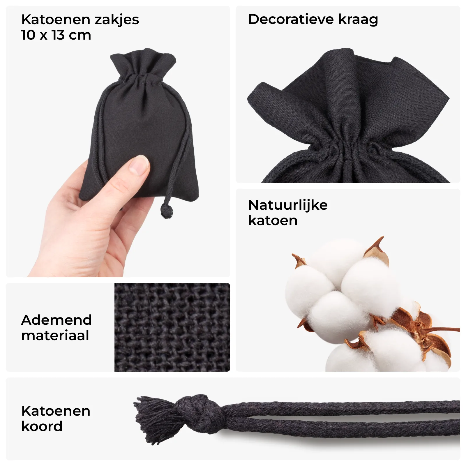 Kleine maar veelzijdige zakjes van elegant katoen in een zwart kleur in de maat 10 x 13 cm. Het gepresenteerde pakket bestaat uit 10 stuks, waardoor een eenmalige aanschaf van onze practische zakjes langer meegaat.