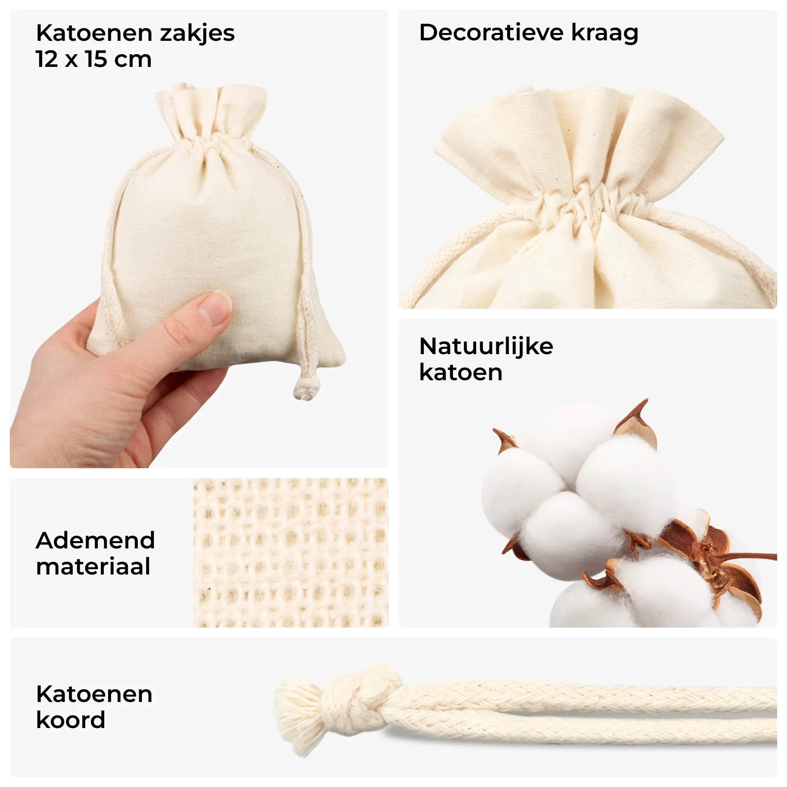 Katoenen zakjes 12 x 15 cm in naturel zijn kleine herbruikbare stoffen zakjes van 100% katoen, handig voor cadeaus, productsets en het opbergen van kleine spullen. Deze set bevat 10 zakjes met een dubbel katoenen trekkoord en een subtiele decoratieve kraag boven de tunnel, zodat het zakje netjes sluit en er verzorgd uitziet.