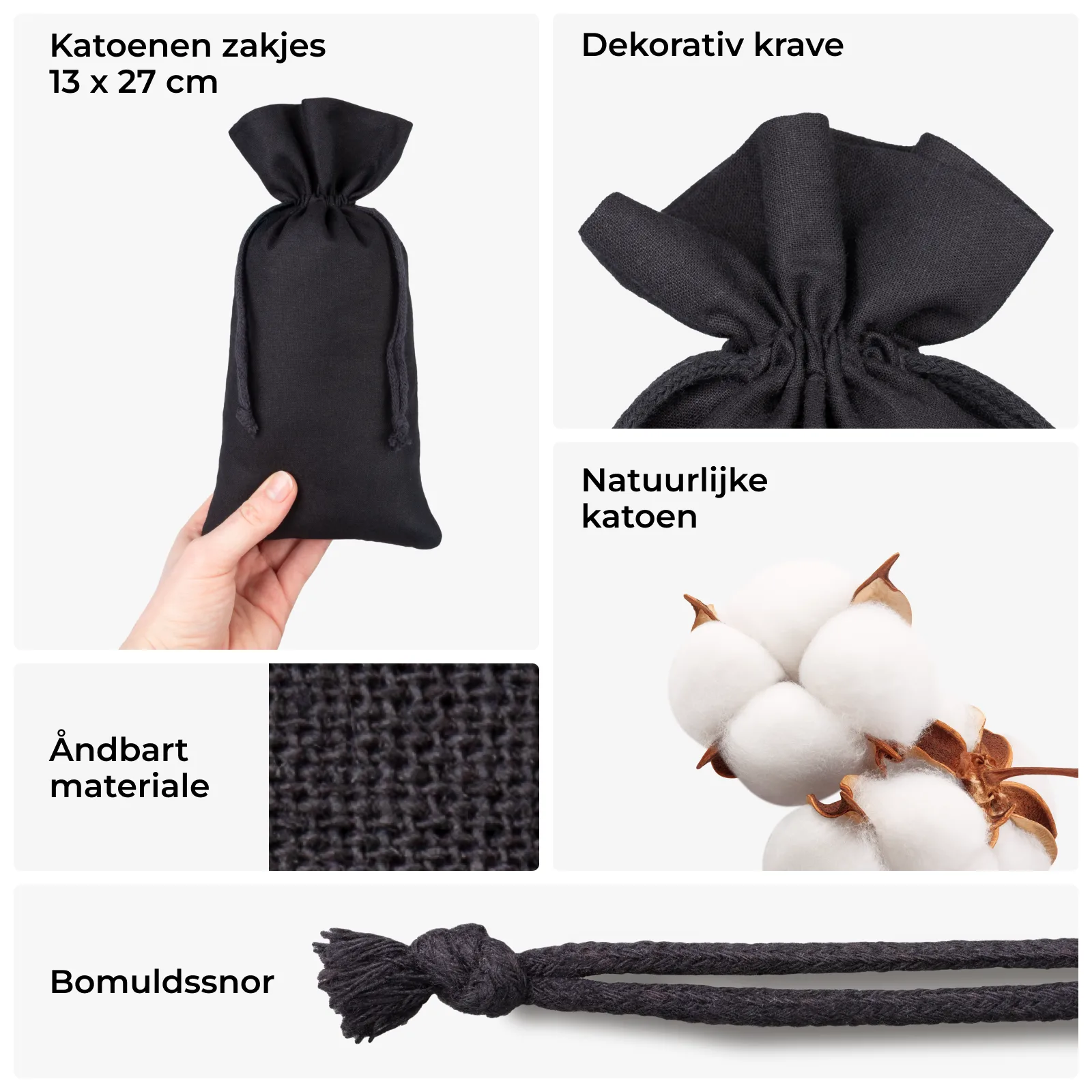 10 stuks Katoenen zakjes 13 x 27 cm – zwart