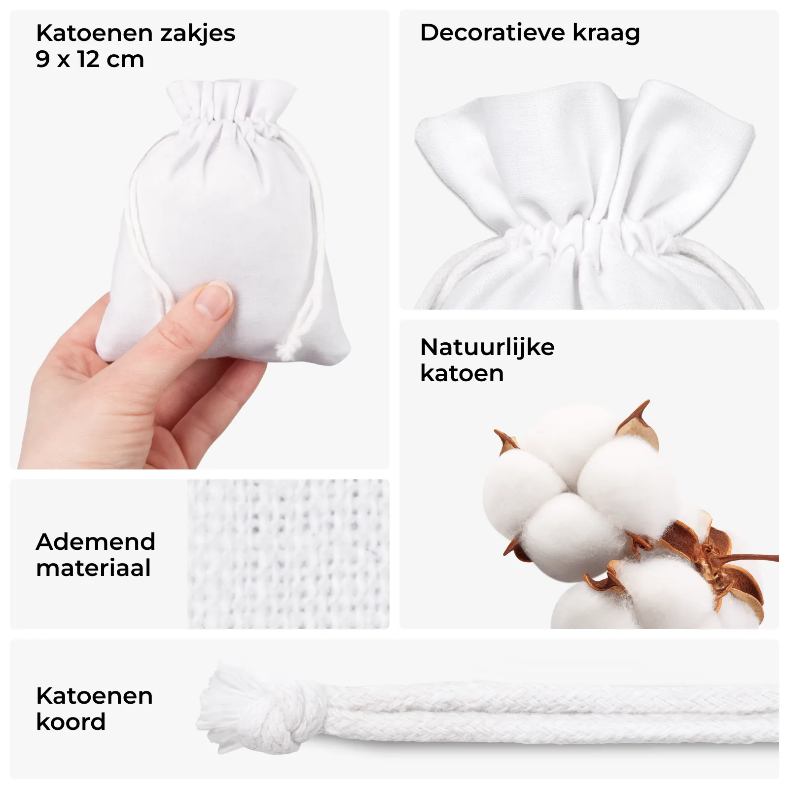 Wij bieden een set van witte 100% katoenen zakjes aan. U kunt deze veelzijdige verpakkingen gebruiken als tafeldecoratie tijdens feestjes (bedankzakjes voor de gasten) of als productverpakking voor bv. juwelen.