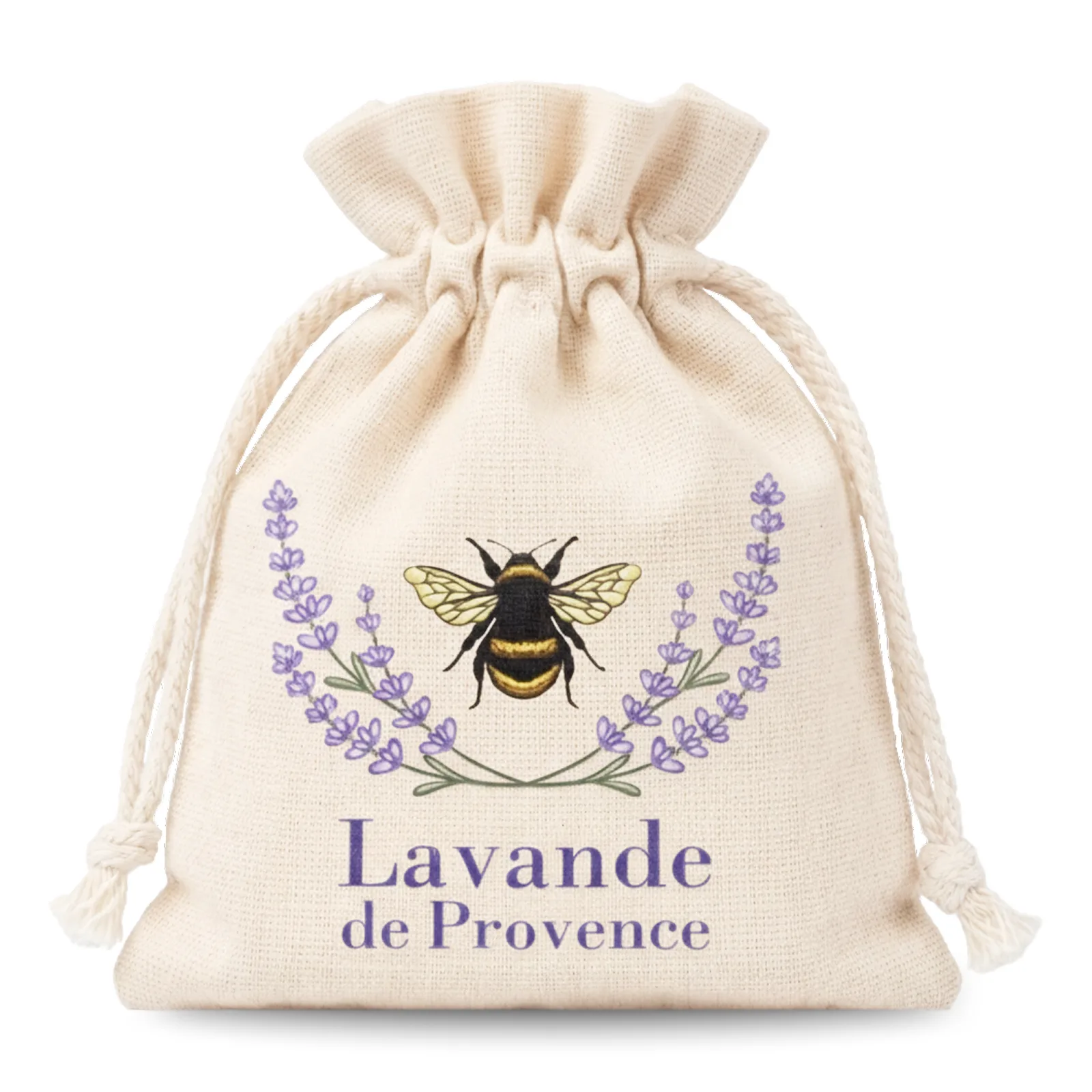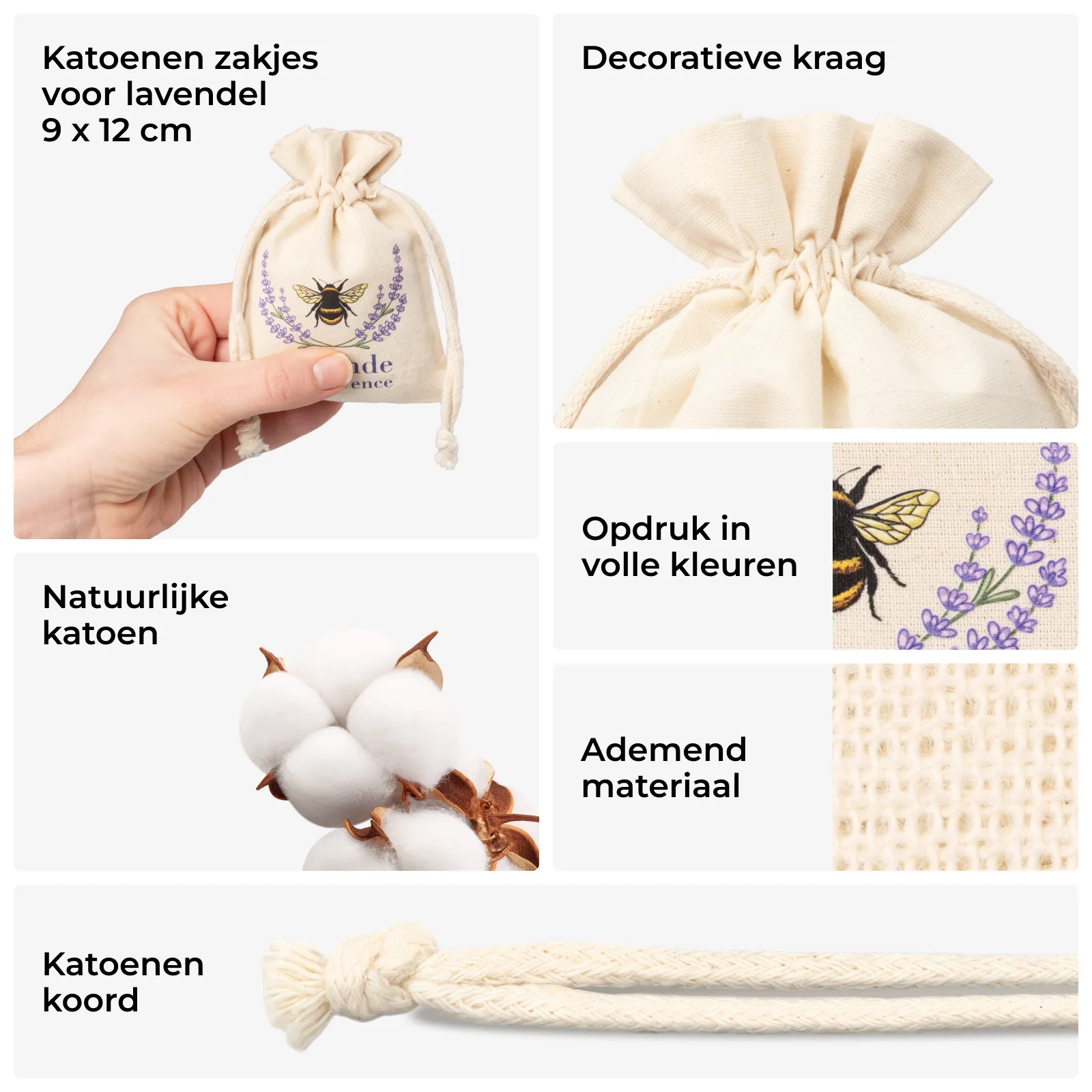 De zakjes zijn gemaakt van 100% katoen in een natuurlijke, beige tint. De stof heeft een licht grovere structuur, voelt prettig aan en is goed luchtdoorlatend, waardoor de zakjes doen denken aan klassieke, rustieke natuurlijke katoenen zakjes 9 x 12. De neutrale kleur vormt een rustige achtergrond voor de paarse lavendelprint met bij, waardoor de zakjes goed passen bij gedroogde lavendel, natuurlijke cosmetica en Provençaalse geschenksets.