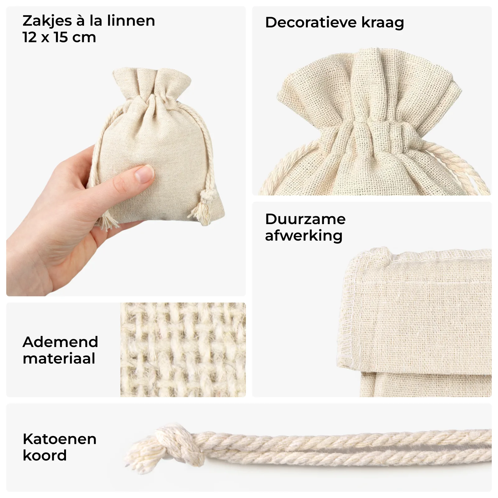 De imitatie linnen zakjes zijn uitgerust met een snel sluitsysteem met een handig koord met decoratieve vlecht. We hebben ervoor gezorgd dat onze kleine linnen zakjes niet alleen functioneel zijn, maar ook tot in het kleinste detail zorgvuldig zijn gemaakt. Daarom zijn ze ideaal voor het opbergen van kleine voorwerpen en voor het inpakken van cadeaus.