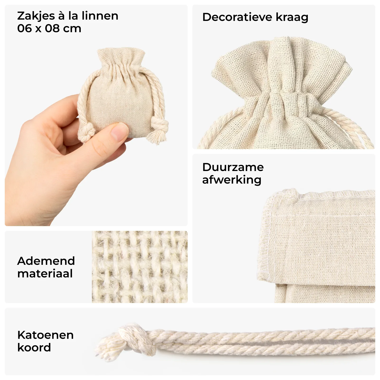 De zakjes zijn gemaakt van een mix van katoen en polyester. Deze stof geeft de uitstraling van linnen, maar is sterker en minder kreukgevoelig. Het materiaal is ademend en prettig in gebruik, met een natuurlijke beige tint en zichtbare structuur. Zo passen de linnenlook zakjes goed bij boho-, eco- en rustieke verpakkingsconcepten. Het dubbele katoenen koord met decoratieve vlecht zorgt voor een nette en betrouwbare sluiting.