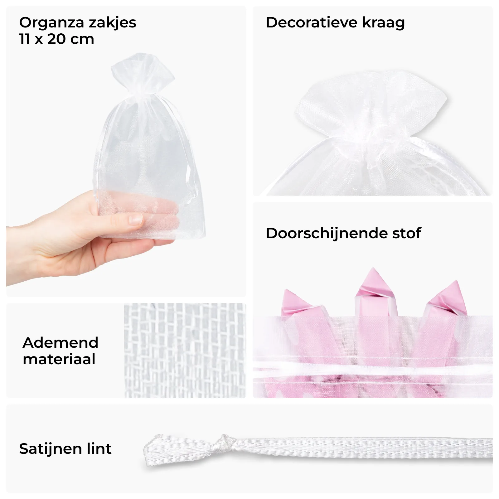 Een set van 25 stuks middelgrote organzazakjes in de kleur wit met afmetingen 11 x 20 cm. Ze worden ook tulen zakjes genoemd of zakjes van tule. Organza is een elegante stof afkomstig uit Turkestan – een regio in Azië. De stof is heel stijlvol en tegelijk luchtig en delicaat. Het universeel uitzicht en de delicate doorzichtigheid ervan zorgen ervoor dat deze stof in elke situatie past. In deze universele zakjes kunnen we allerhande voorwerpen opbergen: juwelen, muntstukken en knopen, maar ook kaarsjes of parfumflesjes. Evenzeer kan je er bloemblaadjes of geurbolletjes in doen. Organza leent zich ook uitstekend als verpakking voor een klein geschenk of cadeau: de stof pakt het stijlvol in en bovendien wordt nog vóór het openen ervan de tip van de sluier opgelicht omdat de stof licht doorzichtig is.