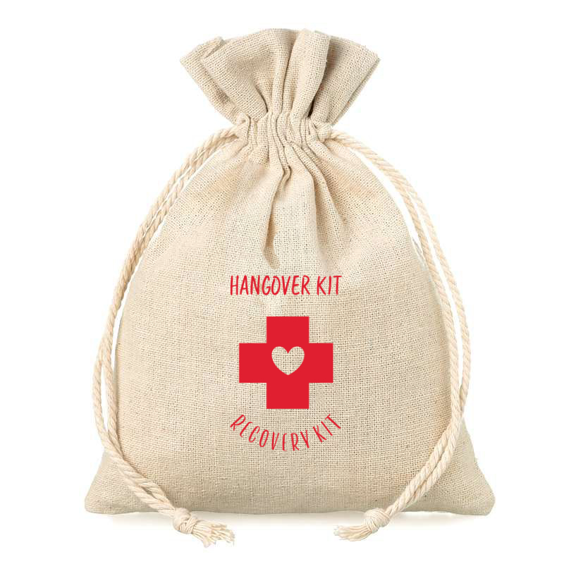 Of het nu gaat om een bruiloft, vrijgezellenfeest, bedrijfsevenement of een verjaardagsfeest, deze linnen-achtige zakjes zijn een geweldig idee. U kunt ze vullen met alles wat u denkt dat uw gasten nodig hebben om de volgende dag door te komen, zoals een zoete snack, pleisters, een isotone drank, kauwgom, een zakje koffie, elektrolyten, vitamines, een hoofdpijntablet. De ontvanger kan het zakje later ook gebruiken als handige organizer of EHBO-doos!