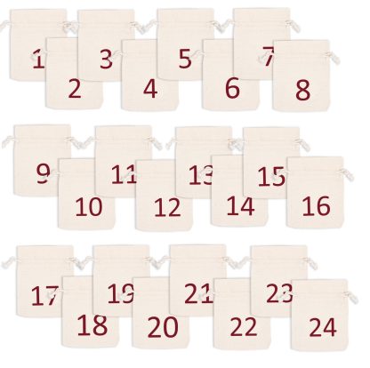 Onze adventskalender zakjes zijn gemaakt van 100% katoen en hebben een prachtige natuurlijke kleur. Ze hebben een dubbel aantrekkoordje, waardoor ze gemakkelijk te openen en sluiten zijn. Bovendien zijn ze verpakt in een papieren wikkel in plaats van plastic, waardoor ze volledig milieuvriendelijk zijn.